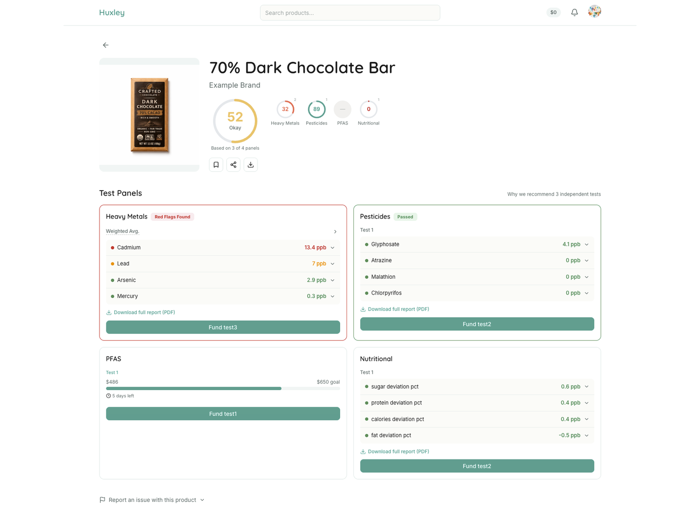 Huxley Pro ($3/month) gives you full detailed results for every tested product on the platform, plus downloadable PDF lab reports. Cancel anytime.