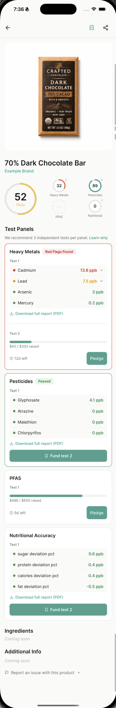 Search any grocery product on the web or scan its barcode on the iOS app. Pick the test panels you care about and pledge toward the ones you want funded.